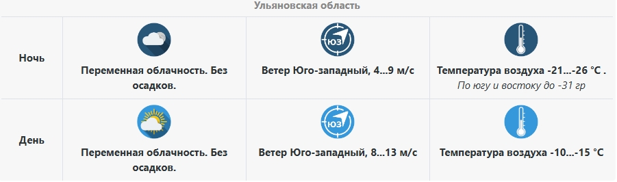 ФГБУ «Приволжское УГМС» сообщает, что сегодня, 27 января, территории Ульяновской области еще будет находится под влиянием области повышенного давления, сохранится морозная погода преимущественно без осадков с ночными температурами местами около -30 градусов.
