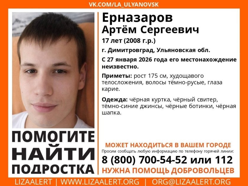 В Димитровграде пропал подросток. Всех, кто знает информацию о его местонахождении, просят сообщить по телефону: 89603606074 (Юлия).