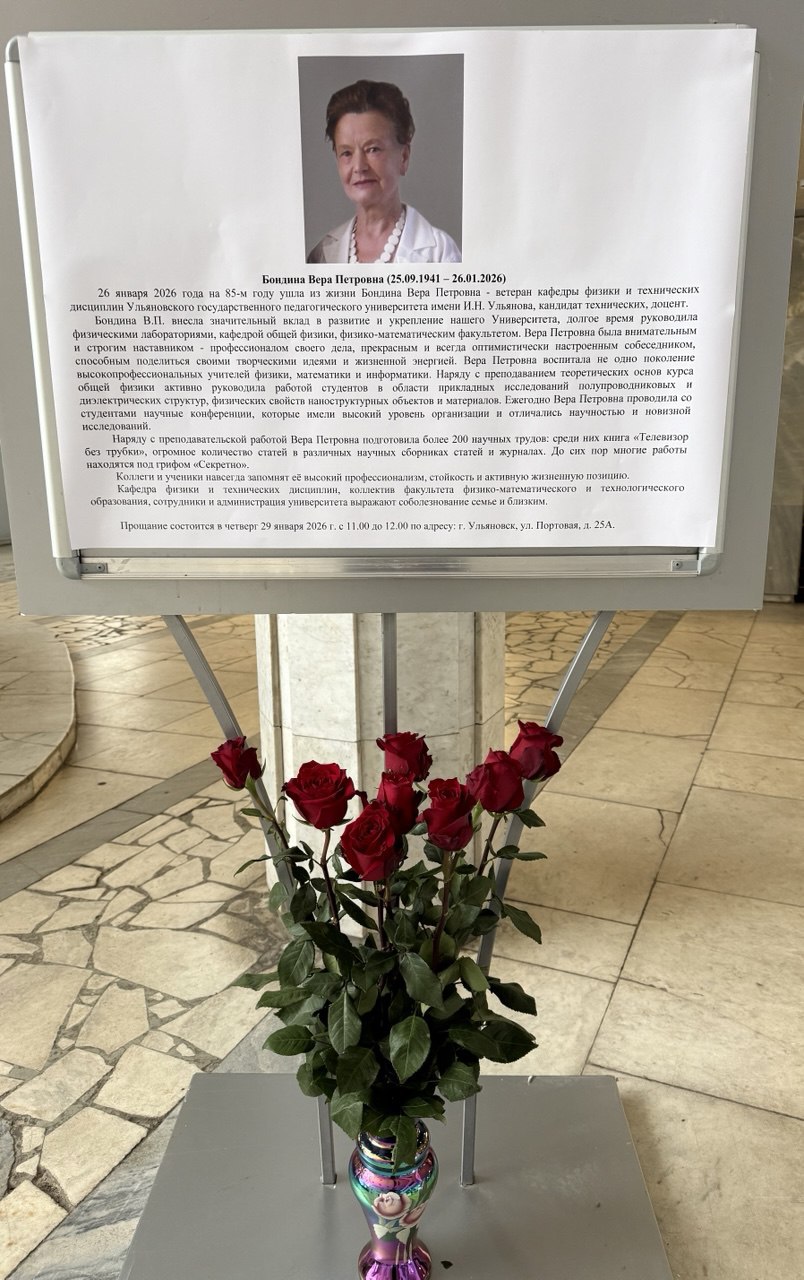 26 января 2026 года на 85-м году ушла из жизни Вера Петровна Бондина – ветеран кафедры физики и технических дисциплин Ульяновского государственного педагогического университет, кандидат технических наук, доцент.