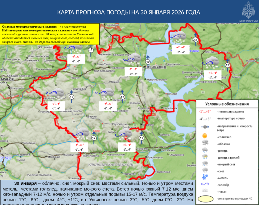 Завтра, 30 января, ожидается облачная погода, мокрый снег, местами сильный. Ночью и утром местами метель, местами гололед, налипание мокрого снега. Ветер ночью южный 7-12 м/с, днем юго-западный 7-12 м/с, ночью и утром отдельные порывы 15-17 м/с. Температура воздуха ночью -1°С, -6°С, днем -4°С, +1°С, в г. Ульяновск: ночью -3°С, -5°С, днем 0°С, -2°С. На дорогах гололедица, местами снежные заносы. По данным Федеральной службы по гидрометеорологии и мониторингу окружающей среды Ульяновского центра по гидрометеорологии и мониторингу окружающей среды — филиала ФГБУ «Приволжское УГМС», ожидается «желтый» уровень опасности.