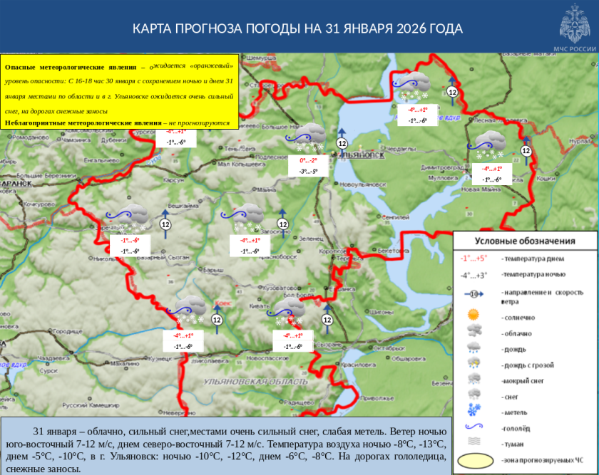 31 января в Ульяновской области облачно, сильный снег,местами очень сильный снег, слабая метель. Ветер ночью юго-восточный 7-12 м/с, днем северо-восточный 7-12 м/c. Температура воздуха ночью -8°С, -13°С, днем -5°С, -10°С, в г. Ульяновск: ночью -10°С, -12°С, днем -6°С, -8°С. На дорогах гололедица, снежные заносы.