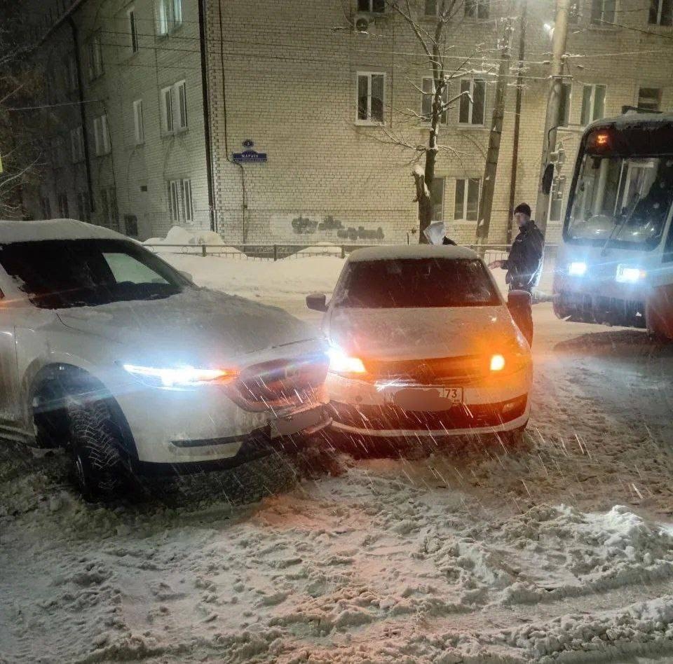 В Ульяновске на перекрестке улиц Можайского и Марата столкнулись две легковушки, которые временно заблокировали движение трамваев.