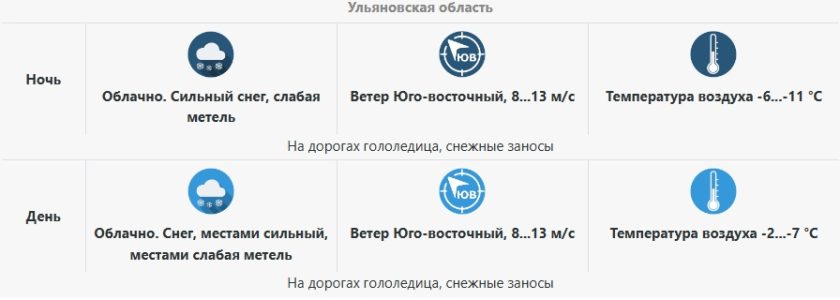 Согласно региональному Гидрометцентру, на территории Ульяновской области сохранится влияние южного циклона, продолжатся снегопады со слабой метелью, на дорогах гололедица, снежные заносы. На регион будет влиять Скандинавский антициклон температурный режим понизится, интенсивность осадков ослабнет.