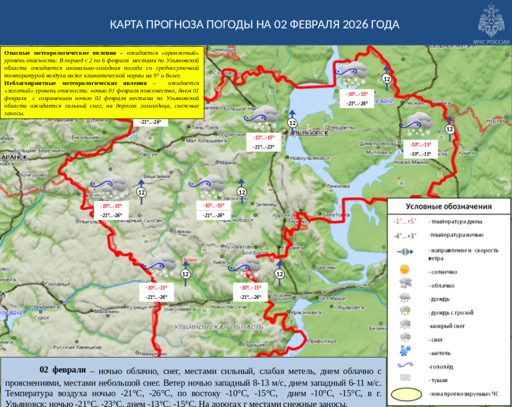 По данным Федеральной службы по гидрометеорологии и мониторингу окружающей среды Ульяновского центра по гидрометеорологии и мониторингу окружающей среды — филиала ФГБУ «Приволжское УГМС», ожидается «оранжевый» уровень опасности. В период с 2 по 6 февраля местами по Ульяновской области ожидается аномально-холодная погода со среднесуточной температурой воздуха ниже климатической нормы на 9° и более.