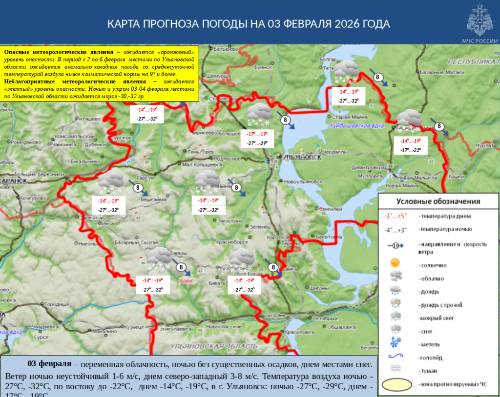 Завтра, третьего февраля, ожидается переменная облачность, ночью без существенных осадков, днем местами снег. Ветер ночью неустойчивый 1-6 м/с, днем северо-западный 3-8 м/с. Температура воздуха ночью -27°С, -32°С, по востоку до -22°С, днем -14°С, -19°С, в г. Ульяновск: ночью -27°С, -29°С, днем -17°С, -19°С.По данным Федеральной службы по гидрометеорологии и мониторингу окружающей среды Ульяновского центра по гидрометеорологии и мониторингу окружающей среды — филиала ФГБУ «Приволжское УГМС», ожидается «желтый» уровень опасности. Ночью и утром 03-04 февраля местами по Ульяновской области ожидается мороз -30,-32 гр.