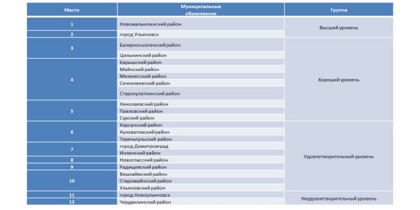 Хороший уровень (2-4 места): Базарносызганский, Цильнинский, Барышский, Майнский, Мелекесский, Сенгилеевский, Старокулаткинский, Николаевский, Павловский, Сурский районы.