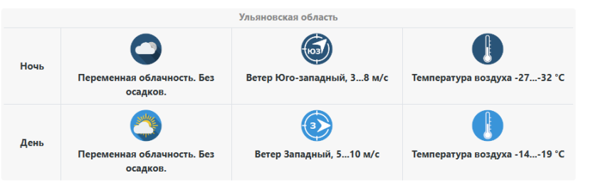 Днём в Ульяновской облати сохранится переменная облачность, осадков не прогнозируется. Температура повысится до −14…−19 °C, но из-за западного ветра 5–10 м/с на улице всё ещё будет зябко.