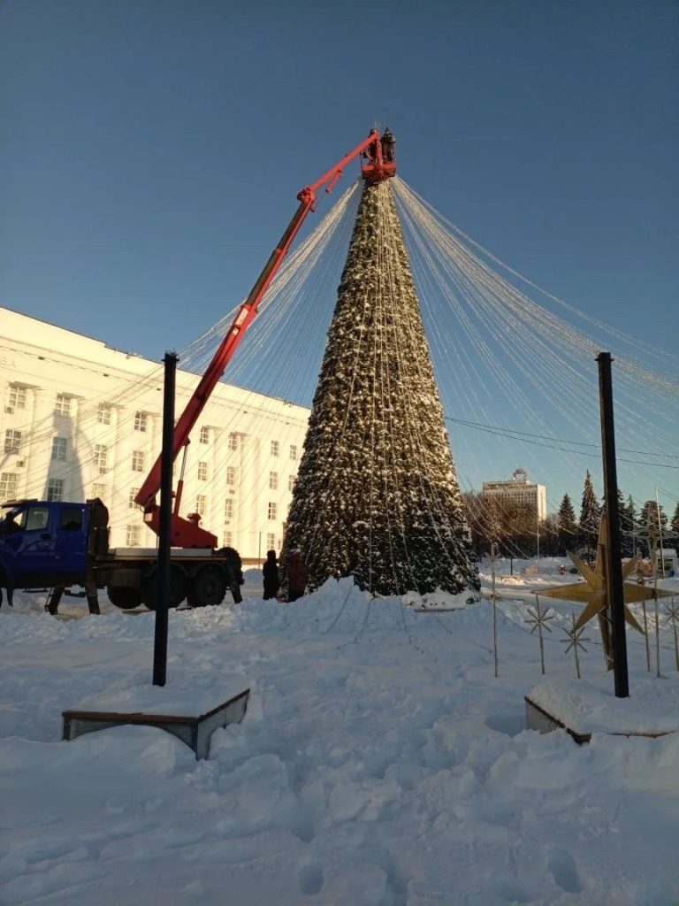 Специалисты начали убирать новогодние украшения. Демонтаж начался с гирлянд с елки на Соборной площади. В ближайшие дни будет убрана сама елка и окружающие её световые фигуры.