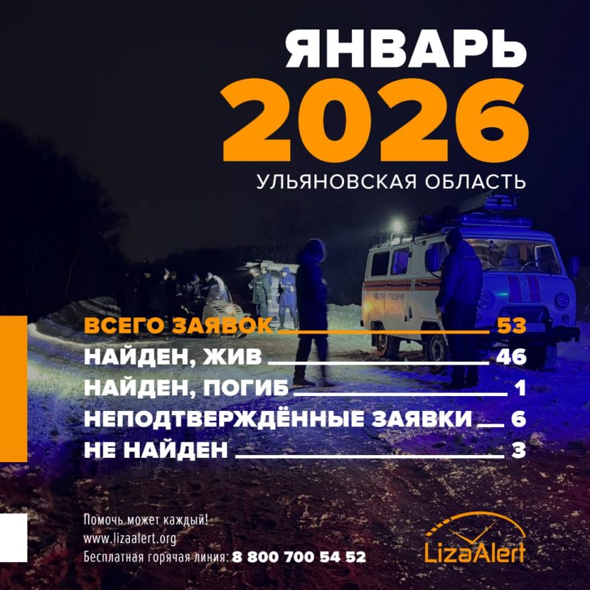 Статистика поискового отряда «ЛизаАлерт» Ульяновской области за январь 2026 года.