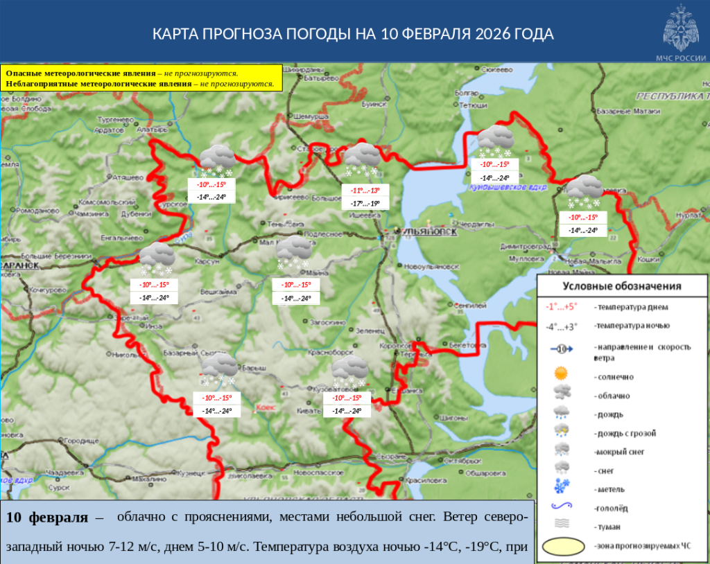 Завтра, 10 февраля, ожидается облачная погода с прояснениями, местами небольшой снег. Ветер северо-западный ночью 7-12 м/с, днем 5-10 м/с. Температура воздуха ночью -14°С, -19°С, при прояснениях до -24°С, днем -10°С, -15°С, в г. Ульяновск: ночью -17°С, -19°С, днем -11°С, -13°С. По данным Федеральной службы по гидрометеорологии и мониторингу окружающей среды Ульяновского центра по гидрометеорологии и мониторингу окружающей среды — филиала ФГБУ «Приволжское УГМС», опасные метеорологические явления не прогнозируются.