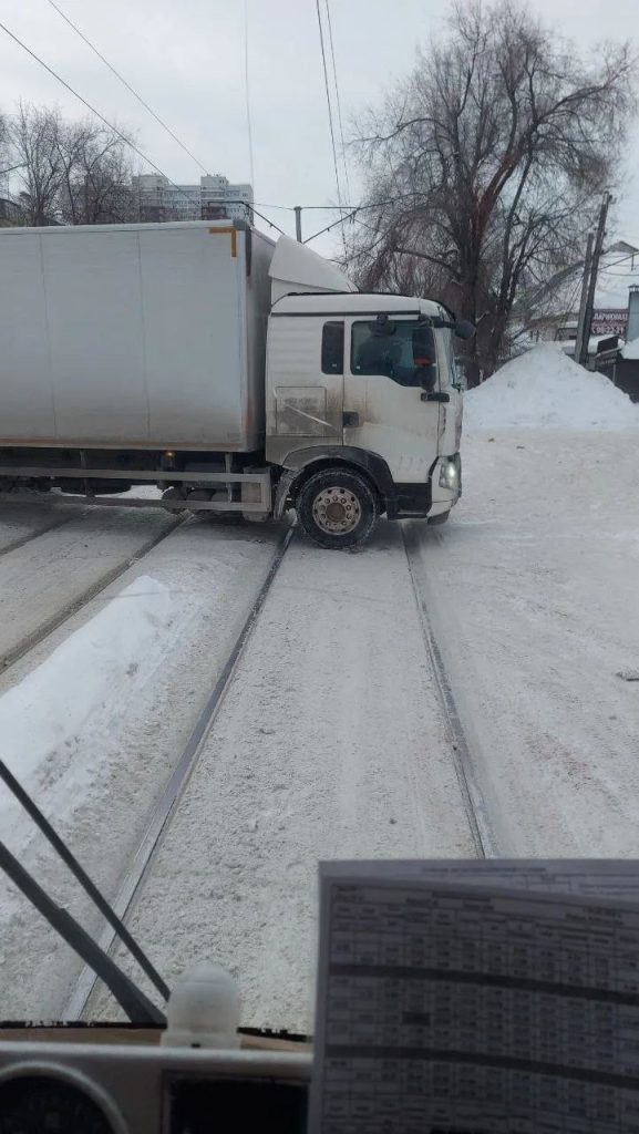 Сегодня, 12 февраля, на улице Радищева произошел инцидент: фура буксует на рельсах около остановки «ул.Симбирская» на улице Радищева. Трамваи едут в объезд через пр. Нариманова и Дамбу.