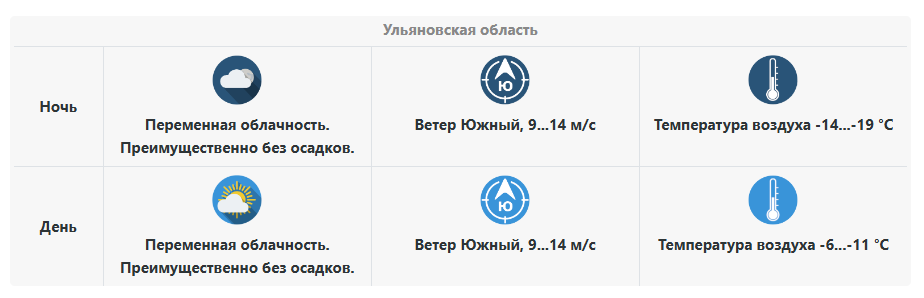 Днём в Ульяновской области сохранится переменная облачность, также преимущественно без осадков. Температура повысится до −6…−11 °C. Южный ветер останется порывистым — 9–14 м/с, что может создавать дополнительный дискомфорт на открытых участках.