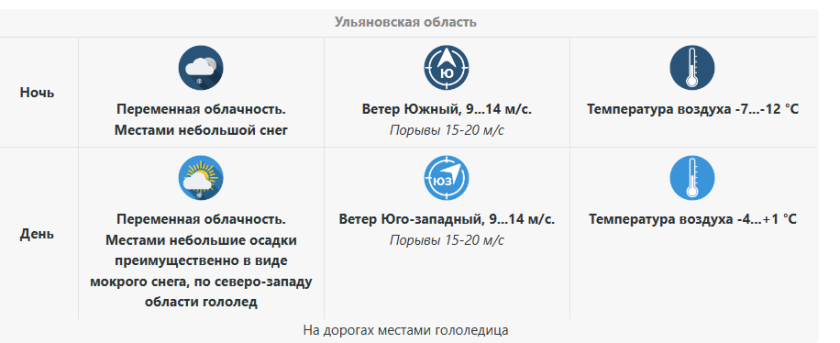 Днём 13 февраля в Ульяновской области сохранится переменная облачность. Местами пройдут небольшие осадки, преимущественно в виде мокрого снега. По северо-западу области возможен гололёд. Температура повысится до −4…+1 °C. Ветер юго-западный, 9–14 м/с, с порывами до 15–20 м/с.