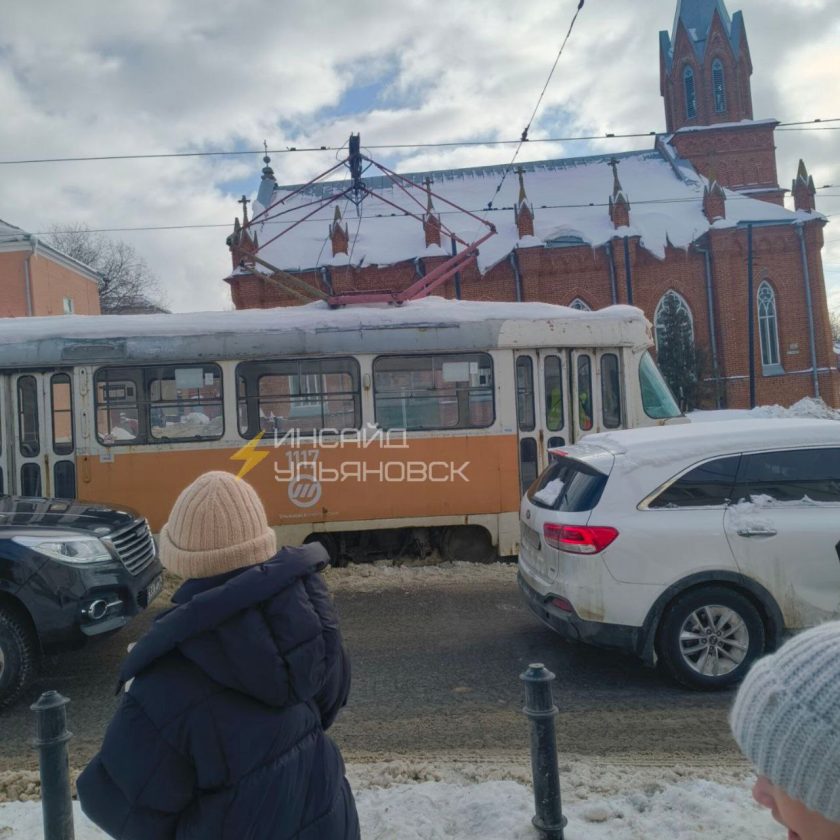 17 февраля в Ульяновске застрял в снегу трамвай на остановке «Дом Ленина» в Ленинском районе.