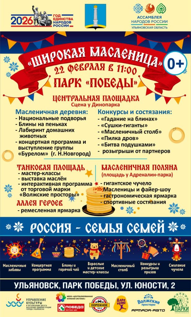 22 февраля в Ульяновске пройдут масштабные масленичные гулянья под общим девизом «Россия — семья семей». Центральной площадкой праздника станет парк «Победы», а также праздничные мероприятия развернутся в парках «Прибрежный», «Семья», «Молодёжный», «Владимирский сад», «40 лет ВЛКСМ» и «Винновская роща».