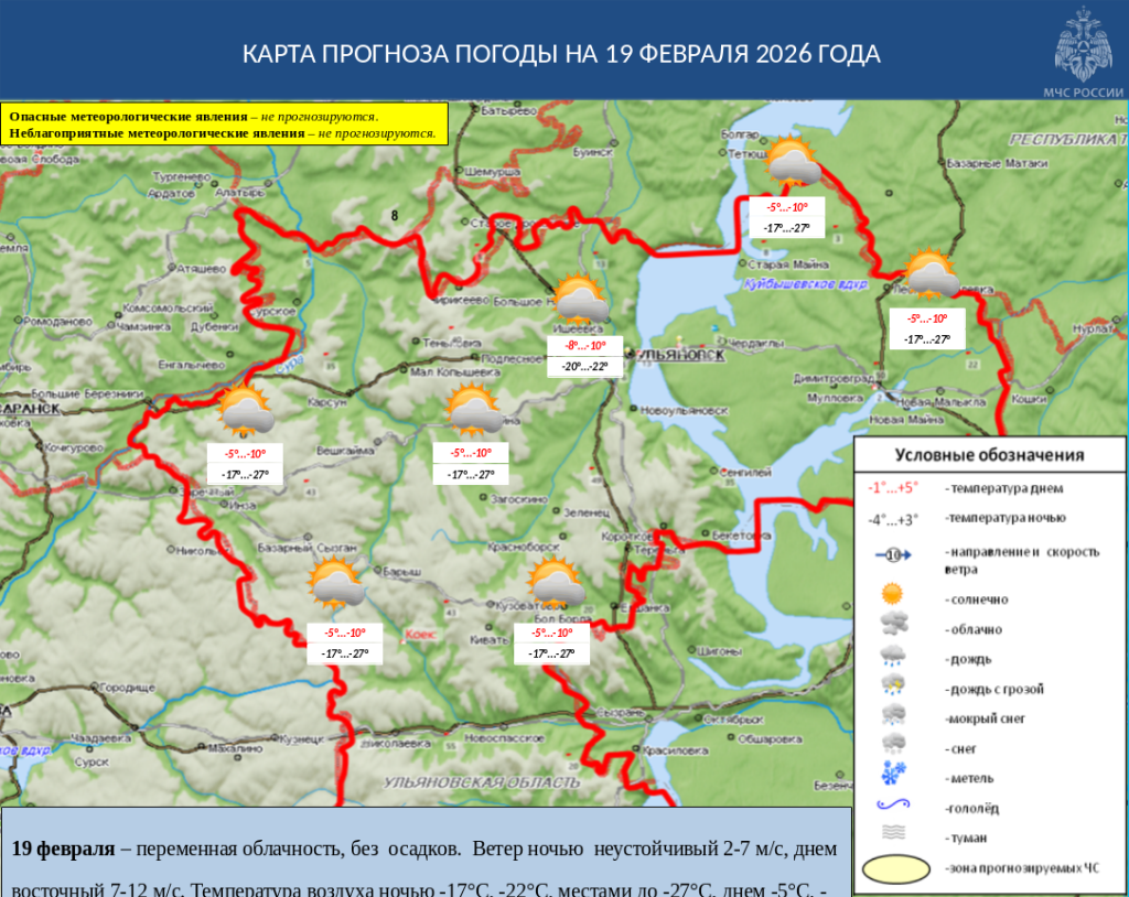19 февраля в Ульяновской области переменная облачность, без осадков. Ветер ночью неустойчивый 2-7 м/с, днем восточный 7-12 м/с. Температура воздуха ночью -17…-22°С, местами до -27°С, днем -5…-10°С, в г. Ульяновске: ночью -20…-22°С, днем -8…-10°С.