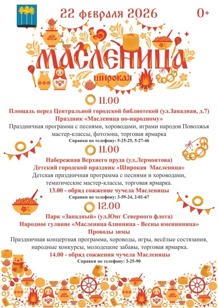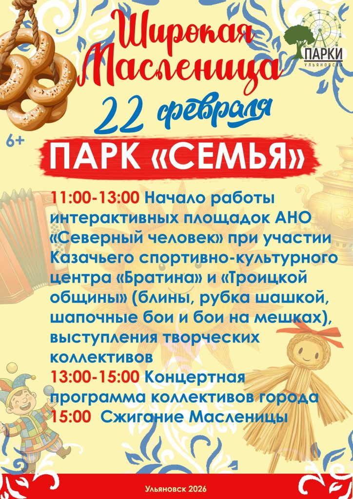 22 февраля с 10:00 в парке «Молодёжный» начнёт работу ярмарка ремесленников, праздничная торговля и мастер-классы. В 12:00 стартует праздничная программа: яркая анимация, выступление гармониста Михаила Жукова, масленичные забавы, а также концерт кавер-группы «Ретромания» из Казани. В 15:00 по традиции будет сожжено чучело Масленицы.
