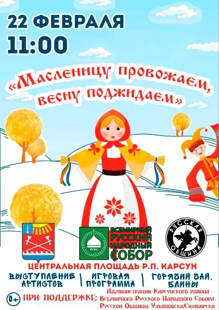 Веселый праздник пройдет 22 февраля в 11.00 на Центральной площади Карсуна. В программе ожидаются горячие блины, чай, а также молодецкие забавы и народные игры: сражения на мечах, бой мешками, метание колец и валенков, прыжки в мешках, перетягивание каната и палки! А также душевные песни и весёлые хороводы!