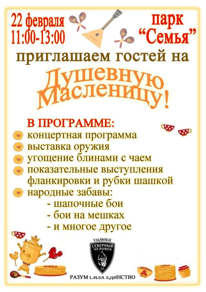 22 февраля с 11.00 до 13.00 в парке «Семья» будут работать интерактивные площадки АНО «Северный человек» при участии Казачьего спортивно-культурного центра «Братина» и «Троицкой общины». Гостям предложат блины, покажут рубку шашкой, устроят шапочные и бои на мешках, выступят творческие коллективы.