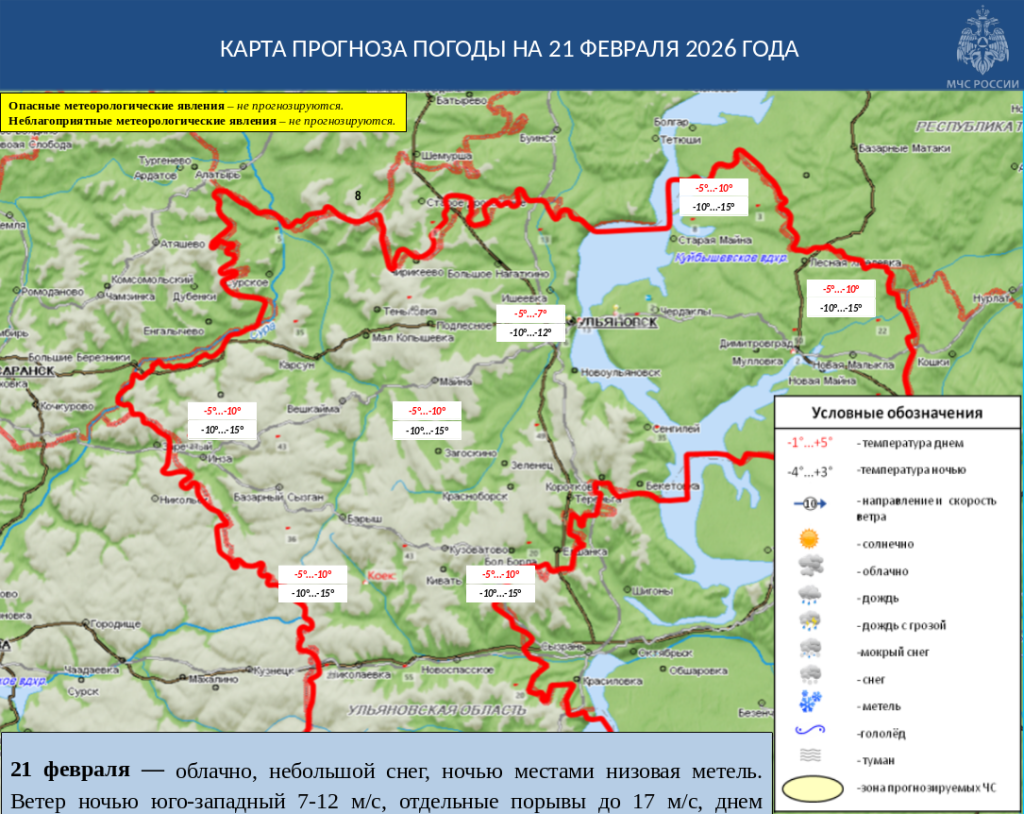 Завтра, 21 февраля, будет облачно, небольшой снег, ночью местами низовая метель. Ветер ночью юго-западный 7-12 м/с, отдельные порывы до 17 м/с, днем западный 9-14 м/с. Температура воздуха ночью -10°С, -15°С, днем -5°С, -10°С, в г. Ульяновск: ночью -10°С, -12°С, днем -5°С, -7°С