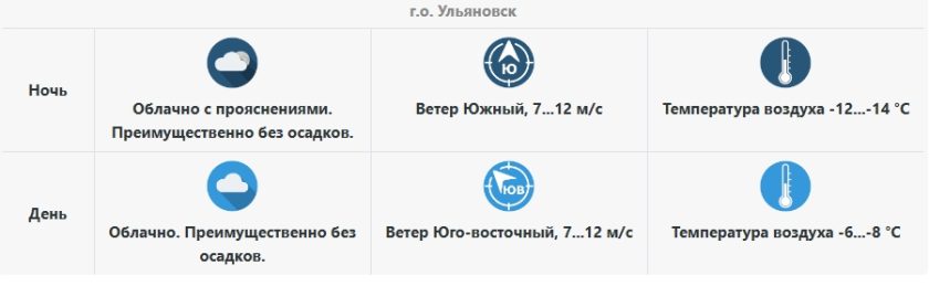 В первой половине рабочей недели Ульяновская область будет находится под влиянием области повышенного давления. В большинстве районов сохранится погода без существенных осадков. Ожидается, что ветер будет 7-12 метров в секунду. Температура 6-8 градусов мороза.