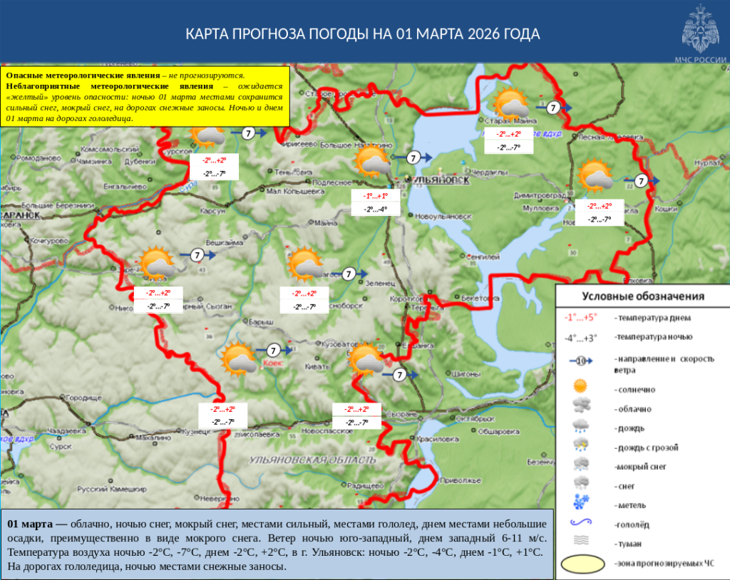 01 марта будет облачно, ночью снег, мокрый снег, местами сильный, местами гололед, днем местами небольшие осадки, преимущественно в виде мокрого снега. Ветер ночью юго-западный, днем западный 6-11 м/с. Температура воздуха ночью -2°С, -7°С, днем -2°С, +2°С, в г. Ульяновск: ночью -2°С, -4°С, днем -1°С, +1°С. На дорогах гололедица, ночью местами снежные заносы.