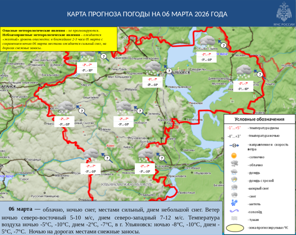 06 марта будет облачно, ночью снег, местами сильный, днем небольшой снег. Ветер ночью северо-восточный 5-10 м/с, днем северо-западный 7-12 м/с. Температура воздуха ночью -5°С, -10°С, днем -2°С, -7°С, в г. Ульяновск: ночью -8°С, -10°С, днем -5°С, -7°С. Ночью на дорогах местами снежные заносы.