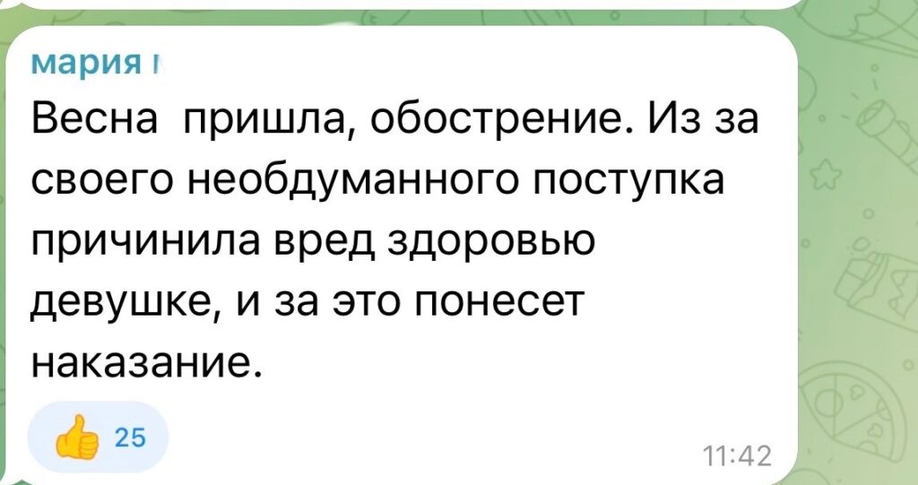 Большой резонанс вызвали и слова нападавшей, которая сообщила, что якобы девушка встречается с ее мужем. Были даже пользователи сети, которые написали, что с любовницами якобы так и надо себя вести (наш портал не одобрят данное поведение и комментарии), однако большинство отметили, что в первую очередь надо разбираться с собственным супругом, а не с другими девушками. Более того, некоторые вовсе считают, что девушка тут не причем и не встречалась с мужчиной.