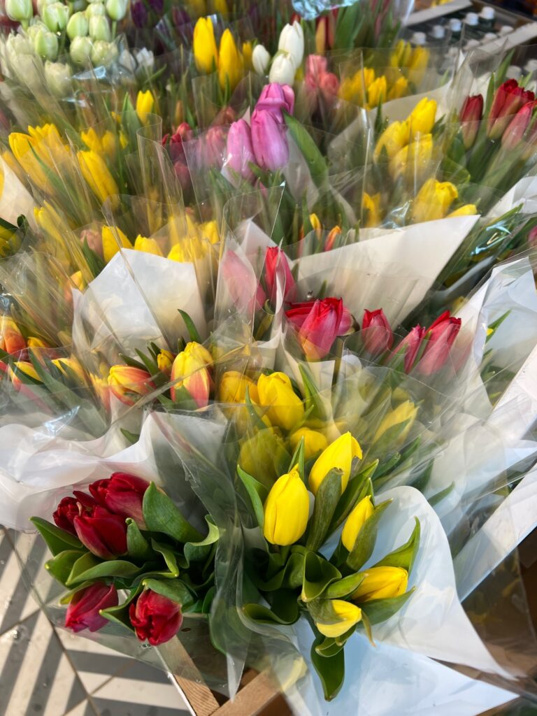 Рядом на витринах расположились розы. Готовые букеты можно найти по цене до пяти тысяч рублей, а популярные цветочные корзинки стоят в пределах двух тысяч. Поштучно розы продают от 240 рублей, кустовые сорта — от 260 рублей. Конечно, есть и стандартные букеты из тюльпанов: композиция из трех штук обойдется в 500 рублей, из пяти — в 800, из семи — в 1100, а из девяти бутонов — в 1400 рублей.