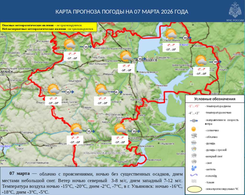 07 марта будет облачно с прояснениями, ночью без существенных осадков, днем местами небольшой снег. Ветер ночью северный 3-8 м/с, днем западный 7-12 м/с. Температура воздуха ночью -15°С, -20°С, днем -2°С, -7°С, в г. Ульяновск: ночью -16°С, -18°С, днем -3°С, -5°С.