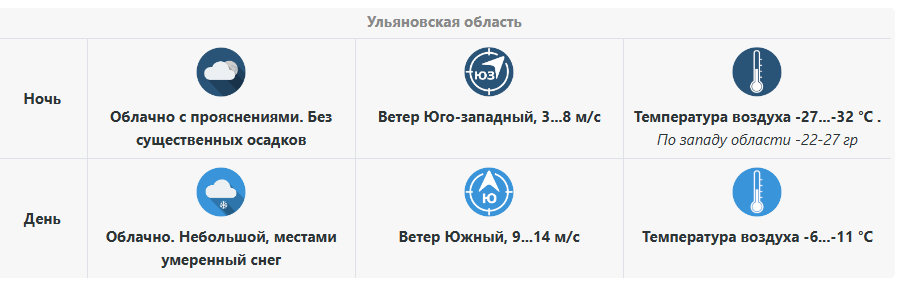 Днём 10 марта в Ульяновской области будет облачно. Пройдёт небольшой, местами умеренный снег. Температура воздуха повысится до −6…−11 °C. Ветер южный, 9–14 м/с, достаточно сильный, поэтому ощущение холода может сохраняться.