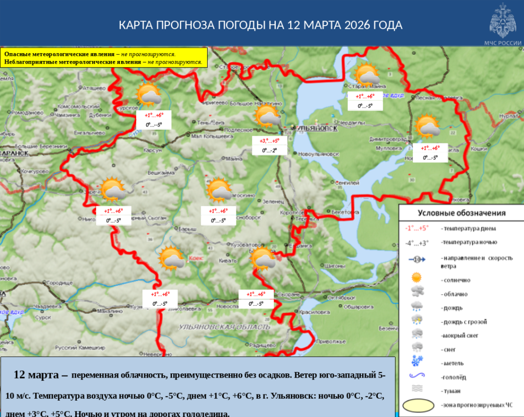 12 марта в Ульяновской области переменная облачность, преимущественно без осадков. Ветер юго-западный 5-10 м/с. Температура воздуха ночью 0°С, -5°С, днем +1°С, +6°С, в г. Ульяновск: ночью 0°С, -2°С, днем +3°С, +5°С. Ночью и утром на дорогах гололедица.