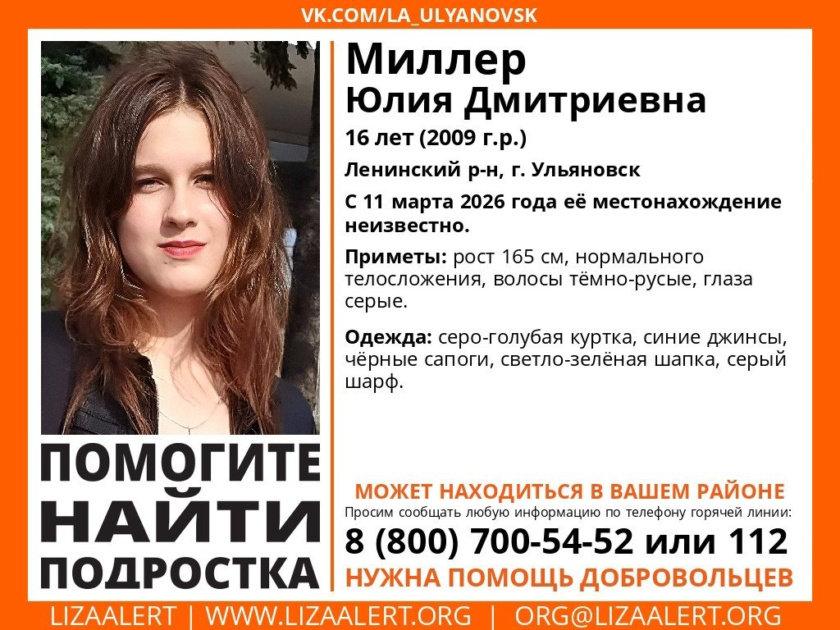 Вчера, 11 марта, в Ульяновске пропала 16-летняя девушка. Всех, кто владеет какой-либо информацией, просят связаться с полицией и волонтерами.