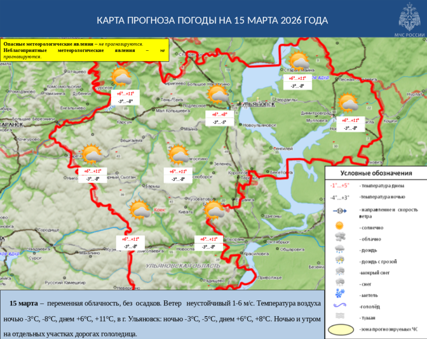 15 марта ожидается переменная облачность, без осадков. Ветер неустойчивый 1-6 м/с. Температура воздуха ночью -3°С, -8°С, днем +6°С, +11°С, в г. Ульяновск: ночью -3°С, -5°С, днем +6°С, +8°С. Ночью и утром на отдельных участках дорогах гололедица.