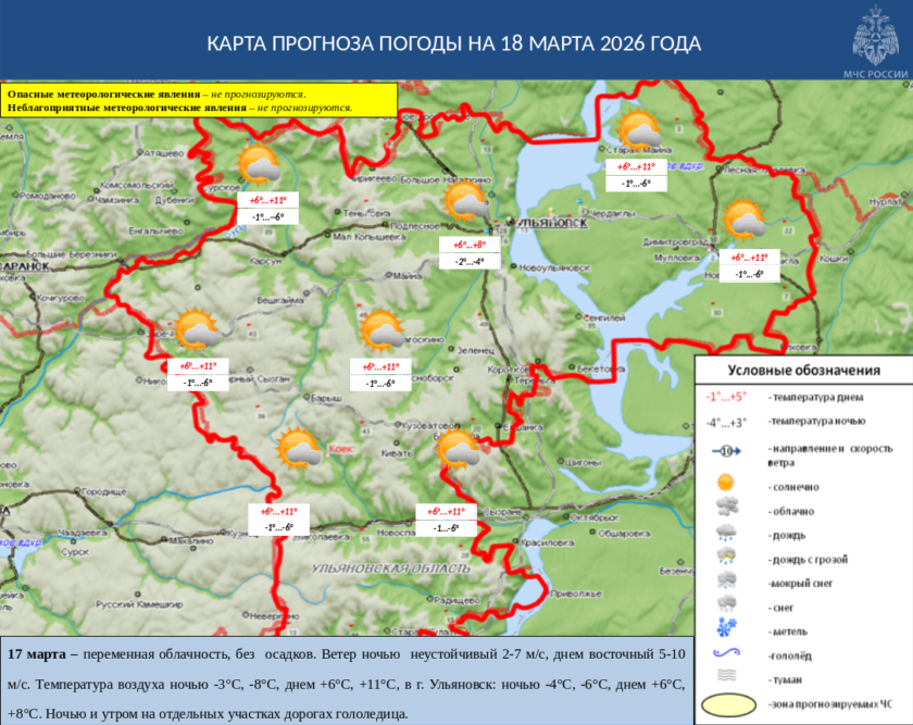 18 марта в Ульяновской области переменная облачность, без осадков. Ветер северо-восточный ночью 3-8 м/с, днем 5-10 м/с. Температура воздуха ночью -1°С, -6°С, днем +6°С, +11°С, в г. Ульяновск: ночью -2°С, -4°С, днем +6°С, +8°С. Ночью и утром на отдельных участках дорогах гололедица.