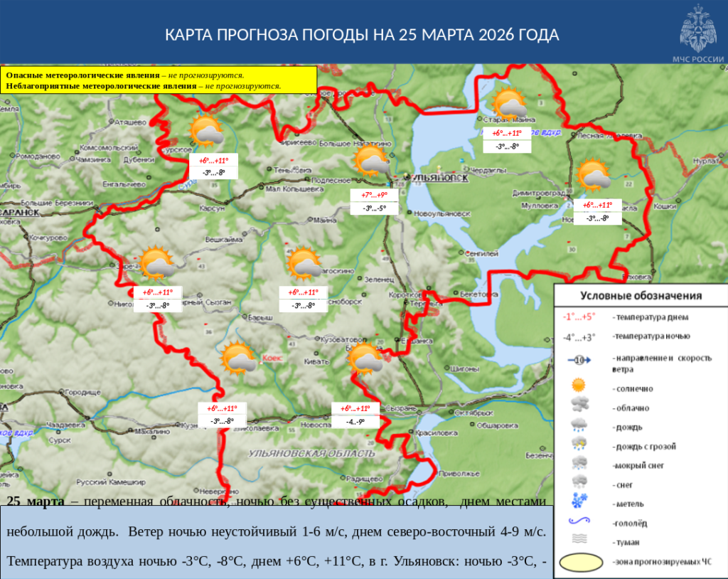 25 марта в Ульяновской области переменная облачность, ночью без существенных осадков, днем местами небольшой дождь. Ветер ночью неустойчивый 1-6 м/с, днем северо-восточный 4-9 м/с. Температура воздуха ночью -3°С, -8°С, днем +6°С, +11°С, в г. Ульяновск: ночью -3°С, -5°С, днем +7°С, +9°С. Ночью и утром на отдельных участках дорог гололедица.