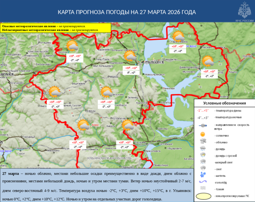 27 марта ночью облачно, местами небольшие осадки преимущественно в виде дождя, днем облачно с прояснениями, местами небольшой дождь, ночью и утром местами туман. Ветер ночью неустойчивый 2-7 м/с, днем северо-восточный 4-9 м/с. Температура воздуха ночью -2°С, +3°С, днем +10°С, +15°С, в г. Ульяновск: ночью 0°С, +2°С, днем +10°С, +12°С. Ночью и утром на отдельных участках дорог гололедица.