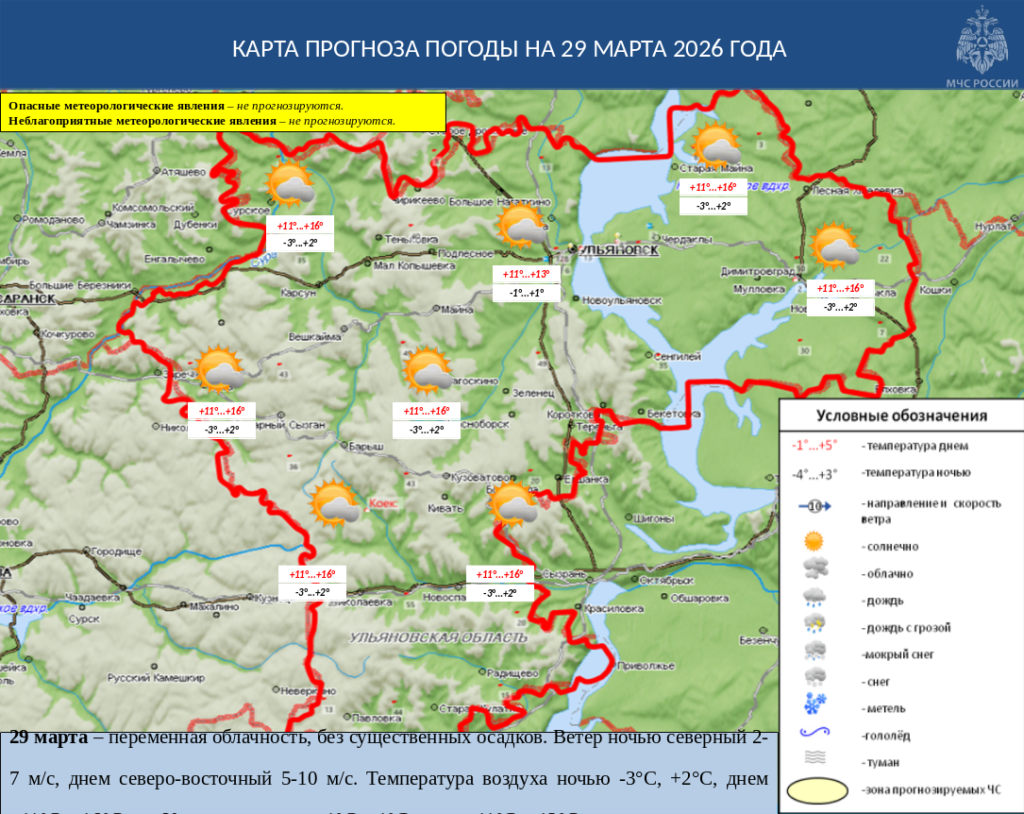 29 марта в Ульяновской области переменная облачность, без существенных осадков. Ветер ночью северный 2-7 м/с, днем северо-восточный 5-10 м/с. Температура воздуха ночью -3°С, +2°С, днем +11°С, +16°С, в г. Ульяновск: ночью -1°С, +1°С, днем +11°С, +13°С