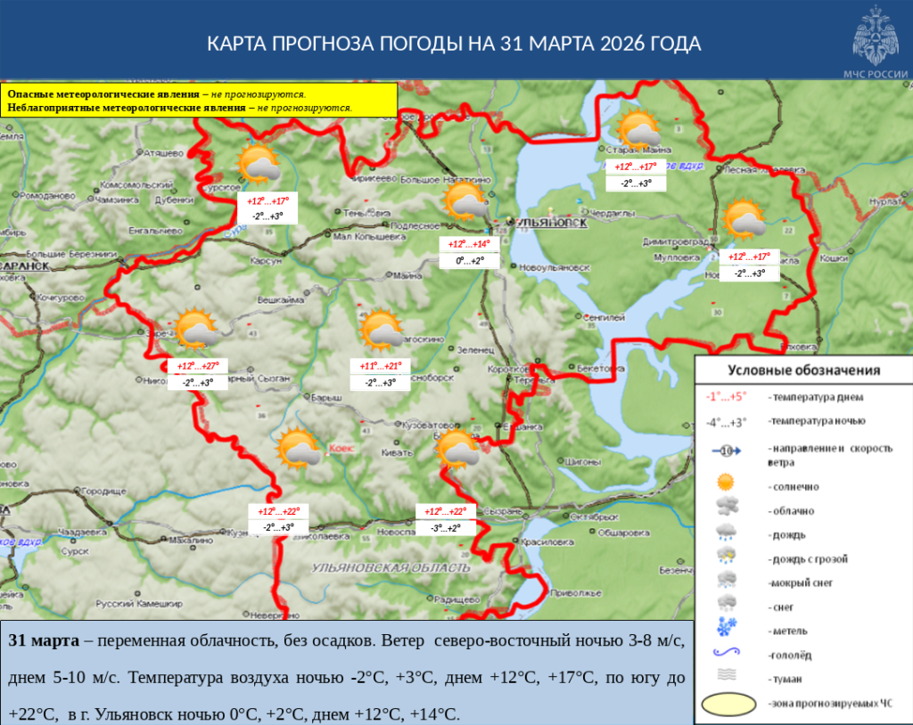 31 марта ожидается переменная облачность, без осадков. Ветер северо-восточный ночью 3-8 м/с, днем 5-10 м/с. Температура воздуха ночью -2°С, +3°С, днем +12°С, +17°С, по югу до +22°С, в г. Ульяновск ночью 0°С, +2°С, днем +12°С, +14°С