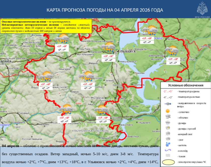 Завтра, 4 апреля, ожидается, что будет облачно с прояснениями, ночью местами небольшой дождь, местами туман, днем без существенных осадков. Ветер западный, ночью 5-10 м/с, днем 3-8 м/с. Температура воздуха ночью +2°С, +7°С, днем +13°С, +18°С, в г. Ульяновск ночью +2°С, +4°С, днем +14°С, +16°С.