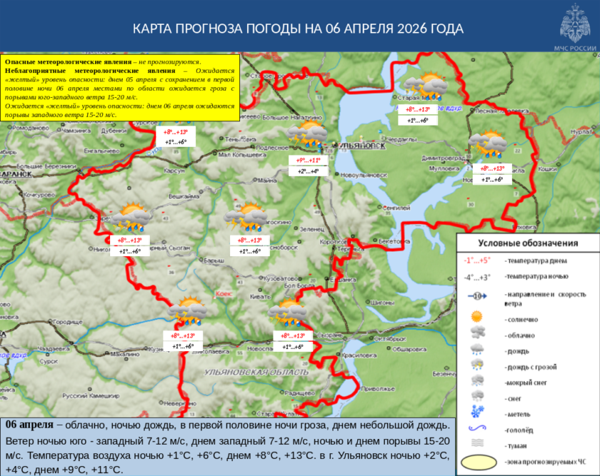 6 апреля в Ульяновской области облачно, ночью дождь, в первой половине ночи гроза, днем небольшой дождь. Ветер ночью юго — западный 7-12 м/с, днем западный 7-12 м/с, ночью и днем порывы 15-20 м/с. Температура воздуха ночью +1°С, +6°С, днем +8°С, +13°С.