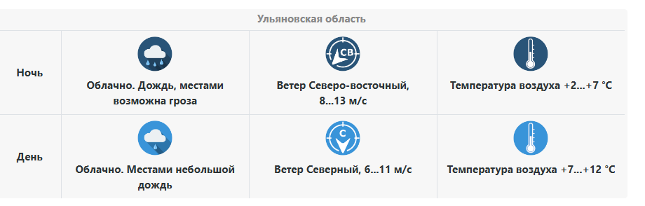 Днём сохранится облачная погода, местами пройдёт небольшой дождь. Температура воздуха повысится до +7…+12 °C. Ветер северный, 6–11 м/с, умеренный.