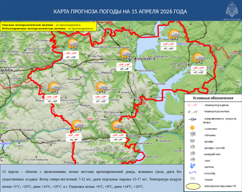 15 апреля в Ульяновской области облачно с прояснениями, ночью местами кратковременный дождь, возможна гроза, днем без существенных осадков. Ветер северо-восточный 7-12 м/с, днем отдельные порывы 15-17 м/с. Температура воздуха ночью +5°С, +10°С, днем +14°С, +19°С. в г. Ульяновск ночью +6°С, +8°С, днем +14°С, +16°С.