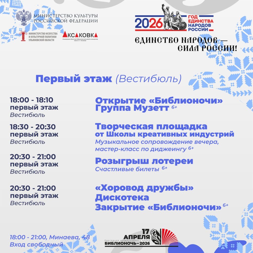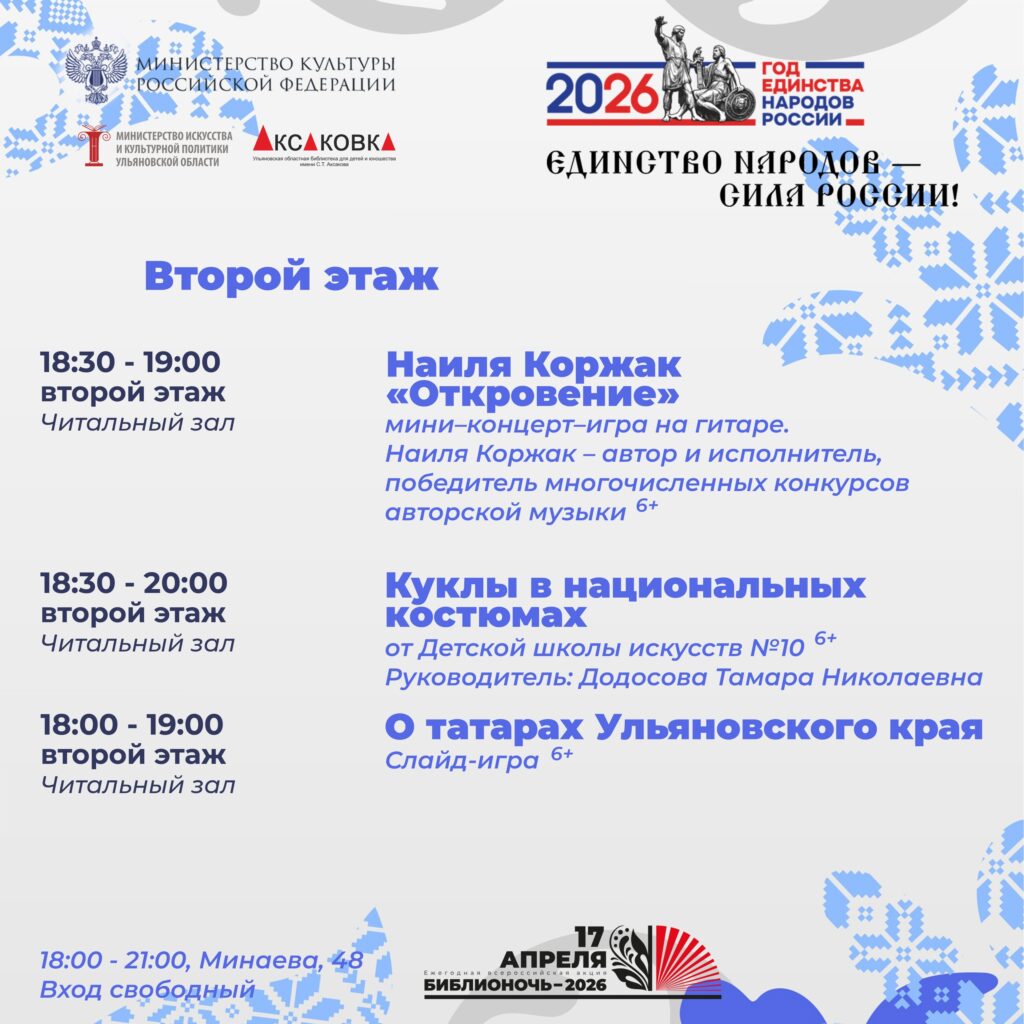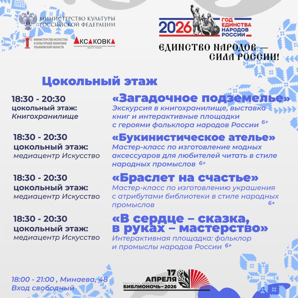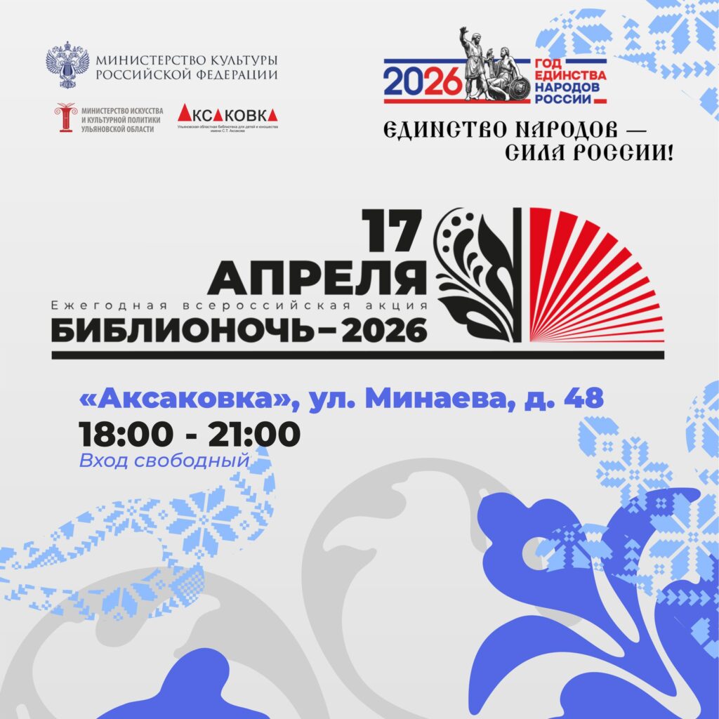 Библионочь в Аксаковке — 17 апреля с 18:00 до 21:00 вас ждёт настоящее путешествие по культуре народов России: творческие площадки, фотозоны, игры, музыкальные выступления, мастер-классы и не только!