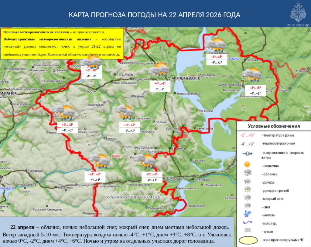 22 апреля – облачно, ночью небольшой снег, мокрый снег, днем местами небольшой дождь. Ветер западный 5-10 м/с. Температура воздуха ночью -4°С, +1°С, днем +3°С, +8°С. в г. Ульяновск ночью 0°С, -2°С, днем +4°С, +6°С. Ночью и утром на отдельных участках дорог гололедица.