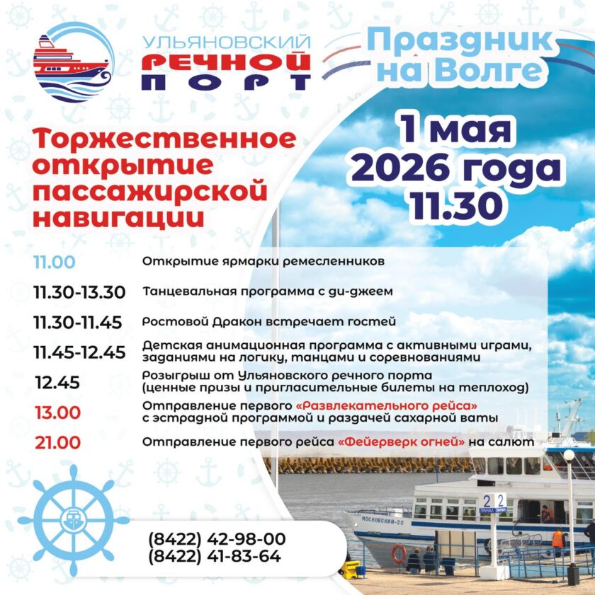 В Ульяновском речном порту 1 мая состоится торжественное открытие пассажирской навигации 2026 года. Для жителей и гостей региона подготовили праздничную программу на весь день.