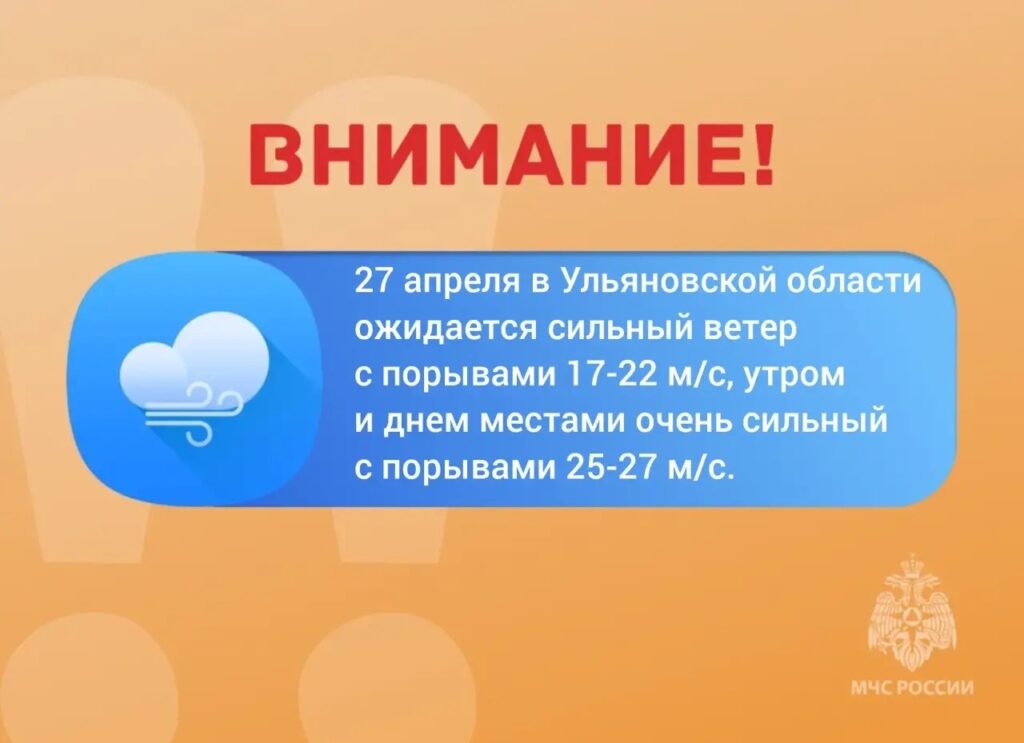 В МЧС сообщают, что ожидается «оранжевый» уровень опасности: 27 апреля в Ульяновской области ожидается сильный ветер с порывами 17-22 м/с, утром и днем местами очень сильный с порывами 25-27 м/с.