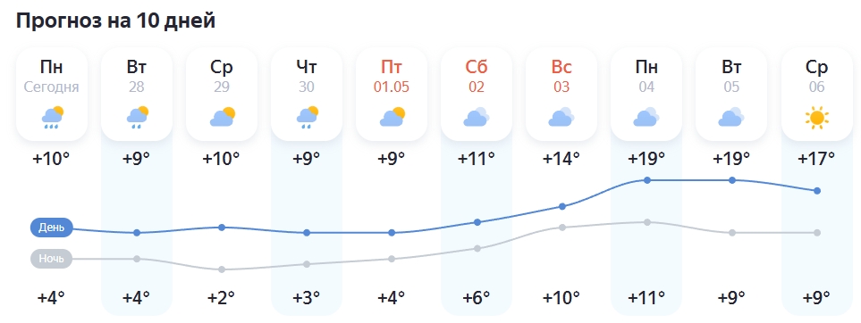 В целом, в ближайшую неделю, по прогнозу, снега не ожидается. Во вторник и четверг возможны дожди. Температура днем будет колебаться в районе +9…+11 градусов, ночью — около +2…+3. На данный момент осадков не ждут и на Первомай: будет облачно, до +11 градусов. Самым теплым днем станет воскресенье — до +14 днем и +10 ночью. Однако из-за ветра температура в выходные по-прежнему будет ощущаться значительно ниже.