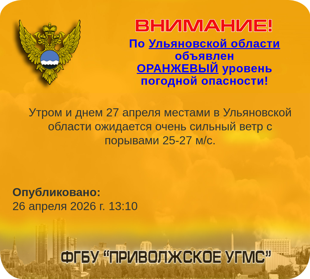 В данный момент в регионе, по данным Гидрометцентра России, объявлен оранжевый уровень опасности. Утром и днем 27 апреля ожидается очень сильный ветер с порывами до 25–27 м/с. Кроме того, из-за западного циклона на территории области прогнозируется дождливая и ветреная погода.