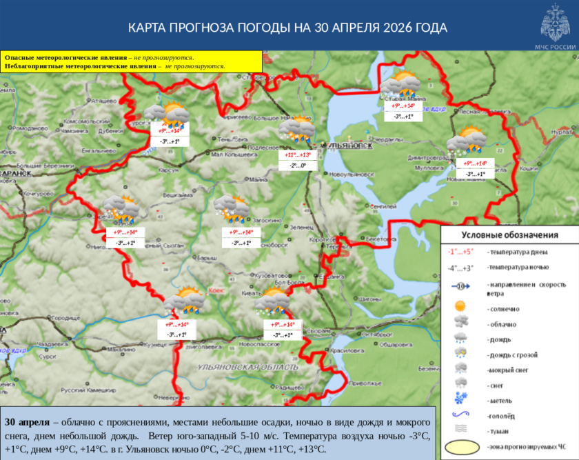 30 апреля в Ульяновской области облачно с прояснениями, местами небольшие осадки, ночью в виде дождя и мокрого снега, днем небольшой дождь. Ветер юго-западный 5-10 м/с. Температура воздуха ночью -3°С, +1°С, днем +9°С, +14°С. в г. Ульяновск ночью 0°С, -2°С, днем +11°С, +13°С.